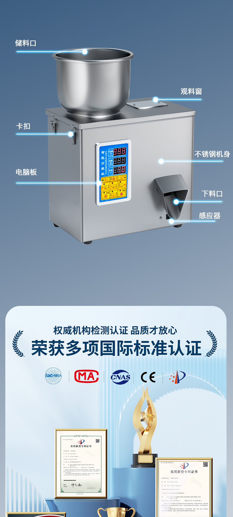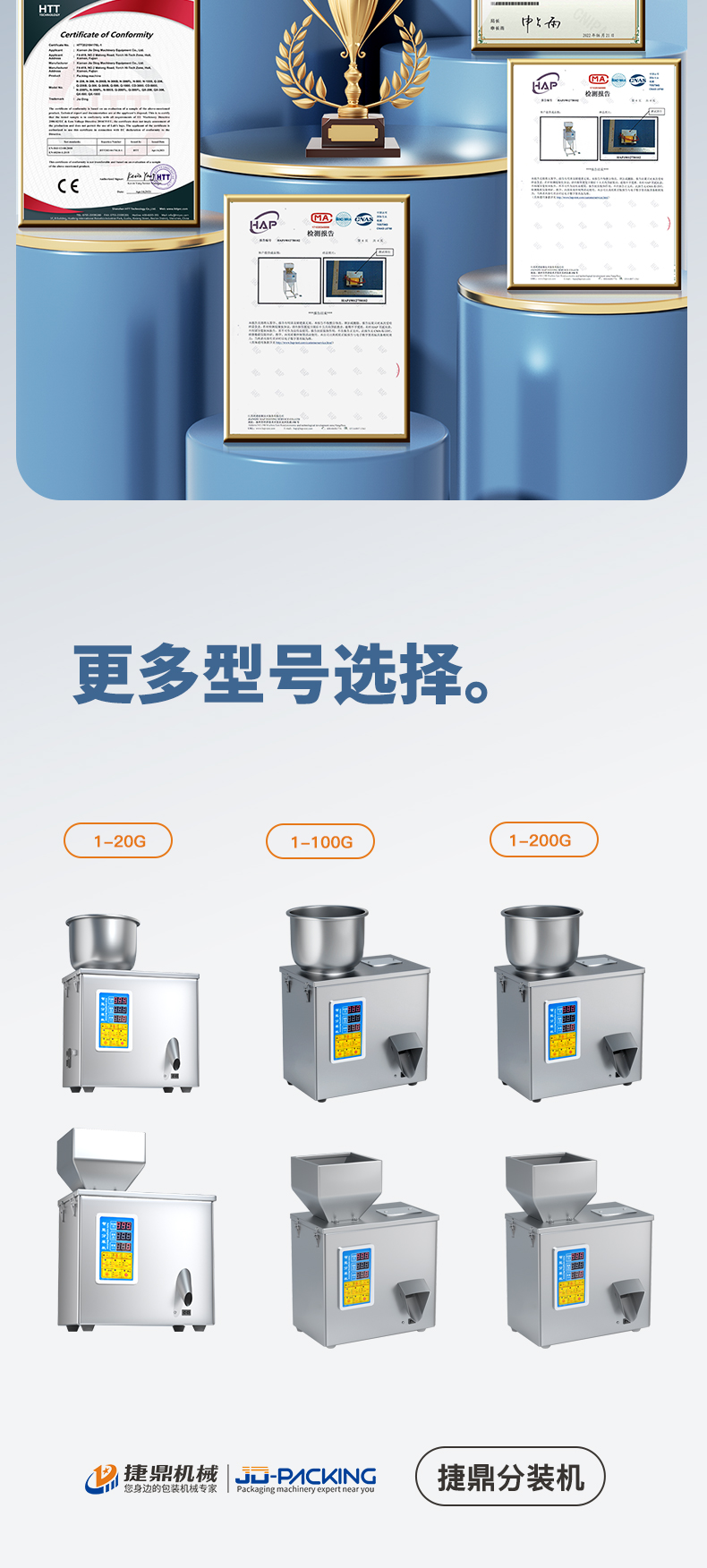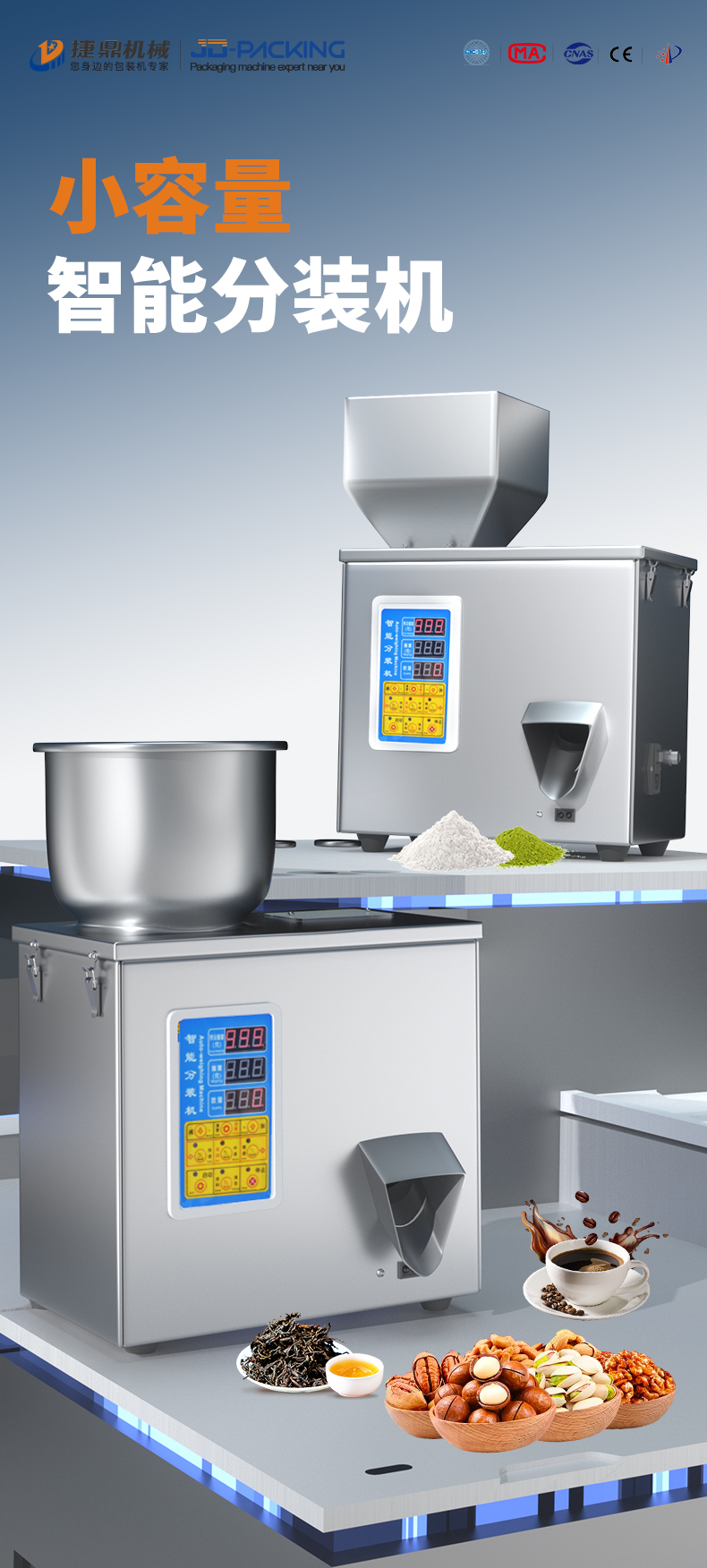 捷鼎生產(chǎn)的1-500克小定量灌裝機適用于瓜子、西瓜子、堅果、五谷雜糧等顆粒、粉末、條形狀、不規(guī)則物料等的定量、稱重、灌裝