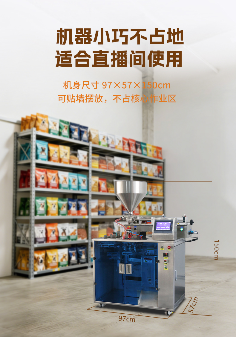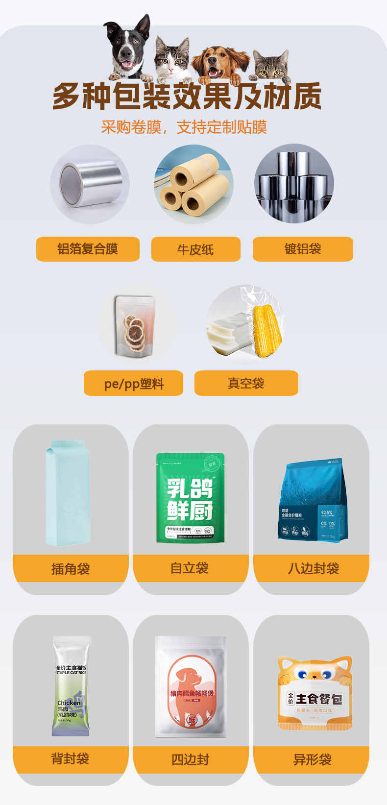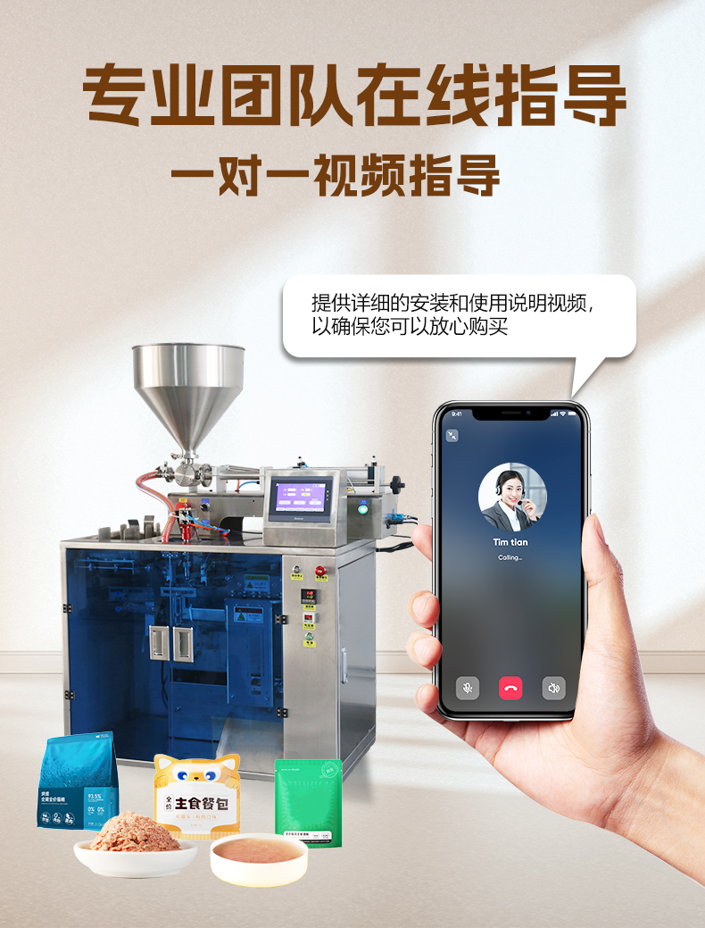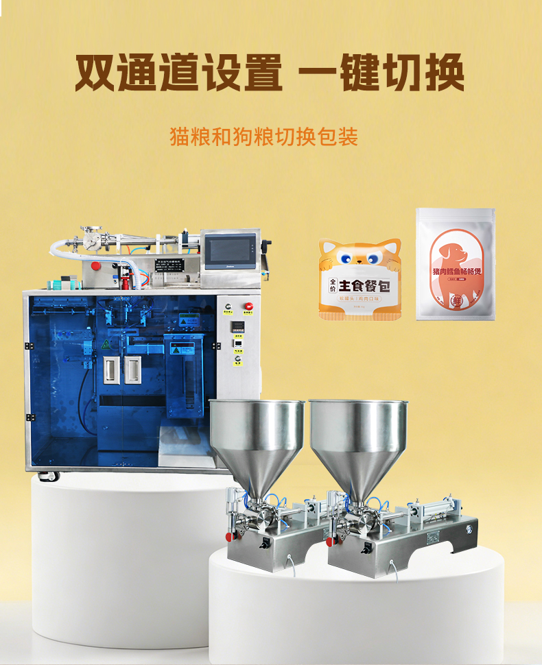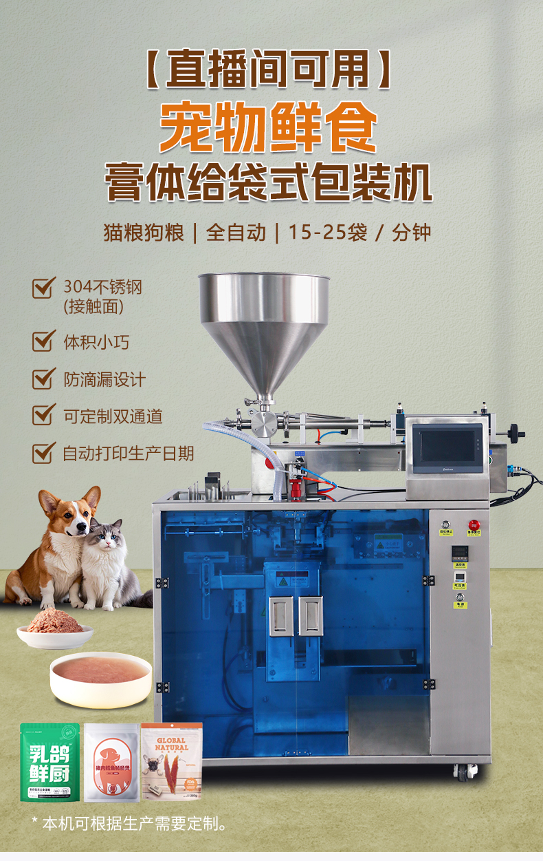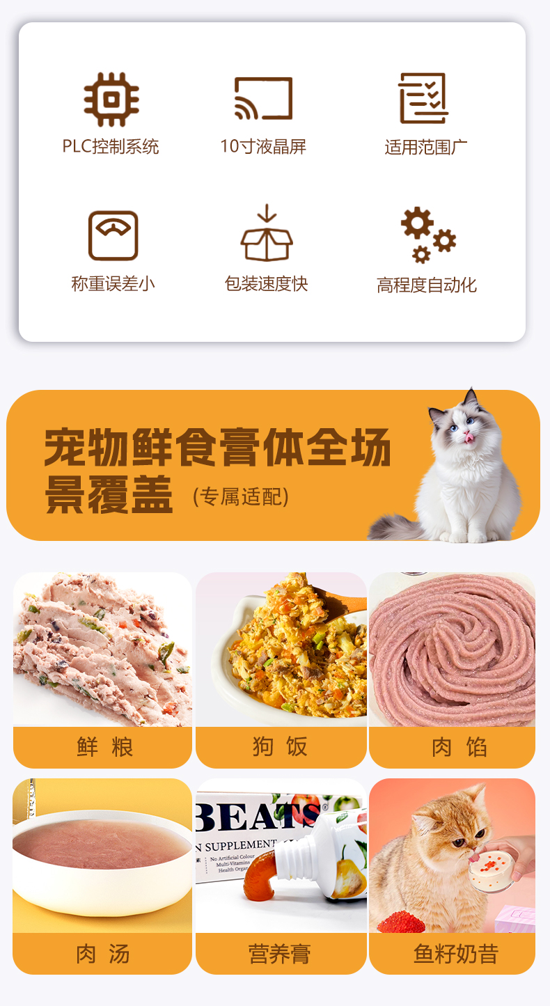 捷鼎生產(chǎn)的寵物食品膏體給袋式包裝機(jī),適用于各類(lèi)大小、形狀的膏體物料(如貓糧、狗糧、鮮食、濕糧、肉糜、肉泥、混合料等產(chǎn)品的定量、稱重、灌裝、包裝、封口)灌裝下料的方式不噴濺,機(jī)器適用于各種類(lèi)型的袋裝,例如:立式拉鏈袋、插腳袋、平口袋、八邊封袋、背封袋、異型袋等,袋寬范圍:10-20cm(寬),袋長(zhǎng)范圍:12-30cm(長(zhǎng))