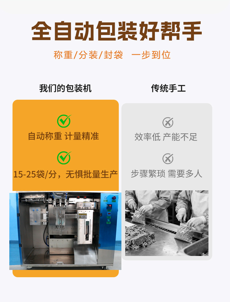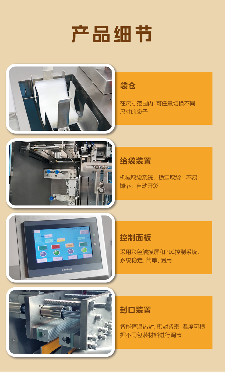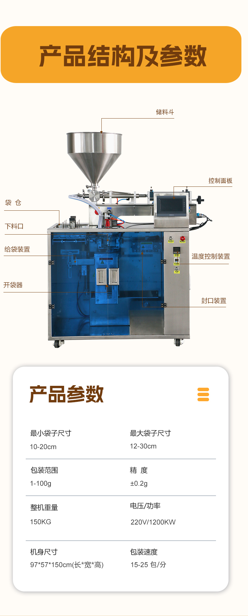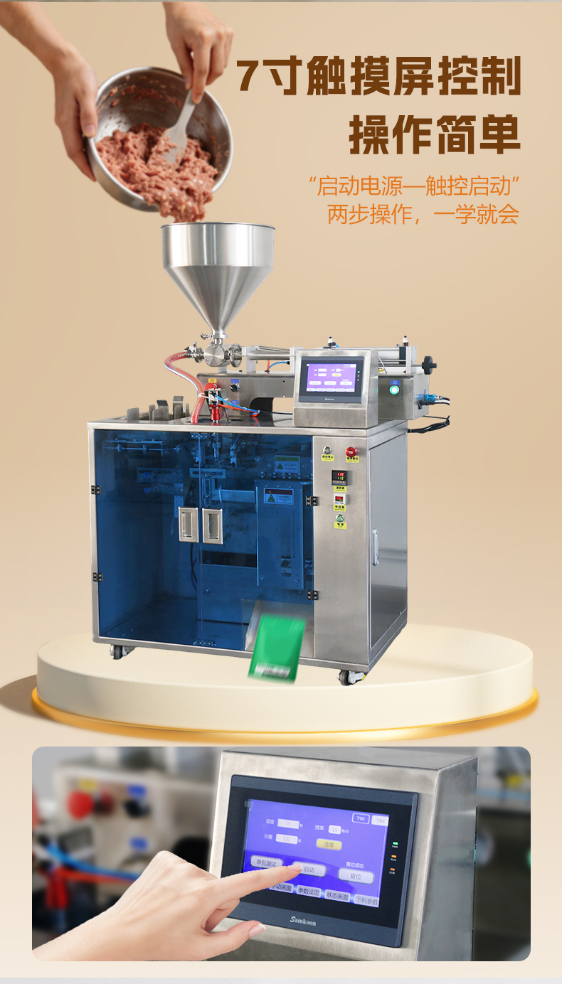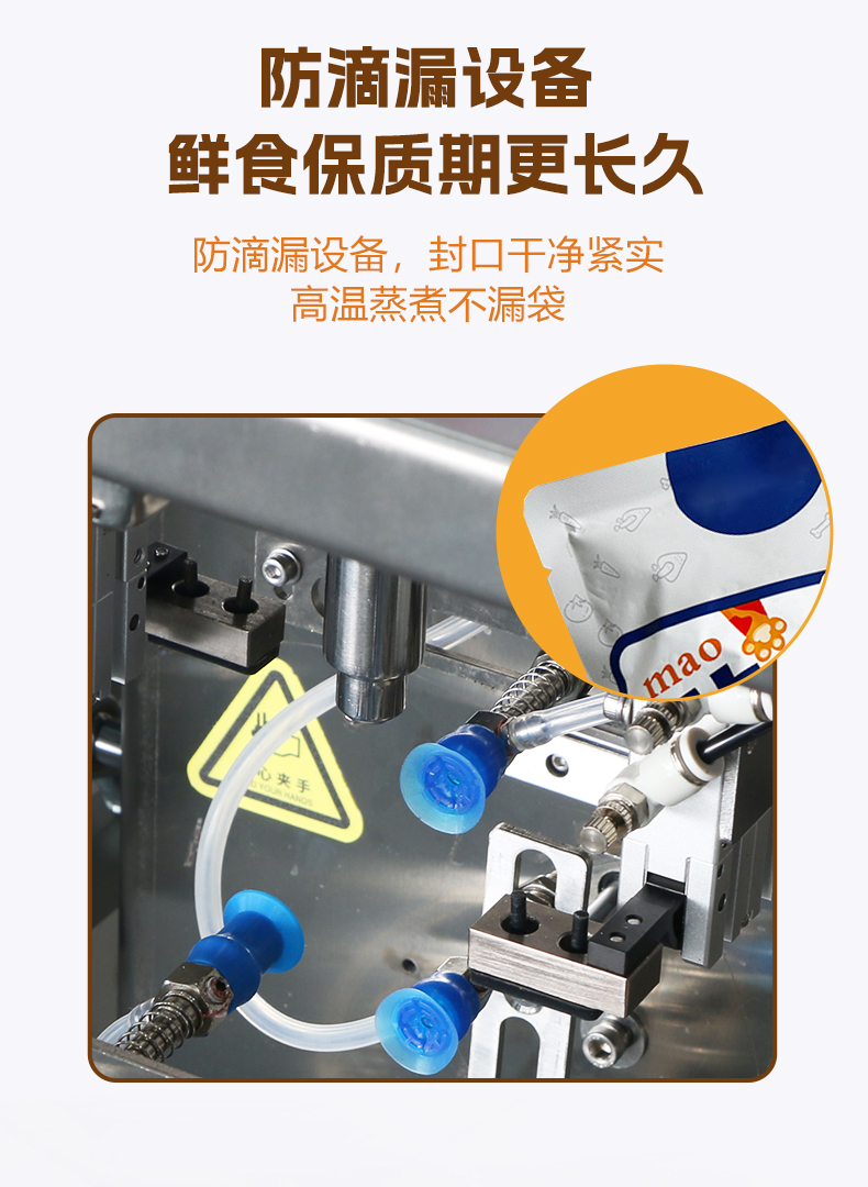 捷鼎生產(chǎn)的寵物食品膏體給袋式包裝機(jī),適用于各類(lèi)大小、形狀的膏體物料(如貓糧、狗糧、鮮食、濕糧、肉糜、肉泥、混合料等產(chǎn)品的定量、稱重、灌裝、包裝、封口)灌裝下料的方式不噴濺,機(jī)器適用于各種類(lèi)型的袋裝,例如:立式拉鏈袋、插腳袋、平口袋、八邊封袋、背封袋、異型袋等,袋寬范圍:10-20cm(寬),袋長(zhǎng)范圍:12-30cm(長(zhǎng))