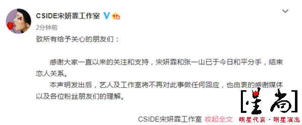明星代言8月5日晚,宋妍霏工作室發(fā)文稱宋妍霏和張一山已于今日和平分手,結(jié)束戀人關(guān)系。全文如下: